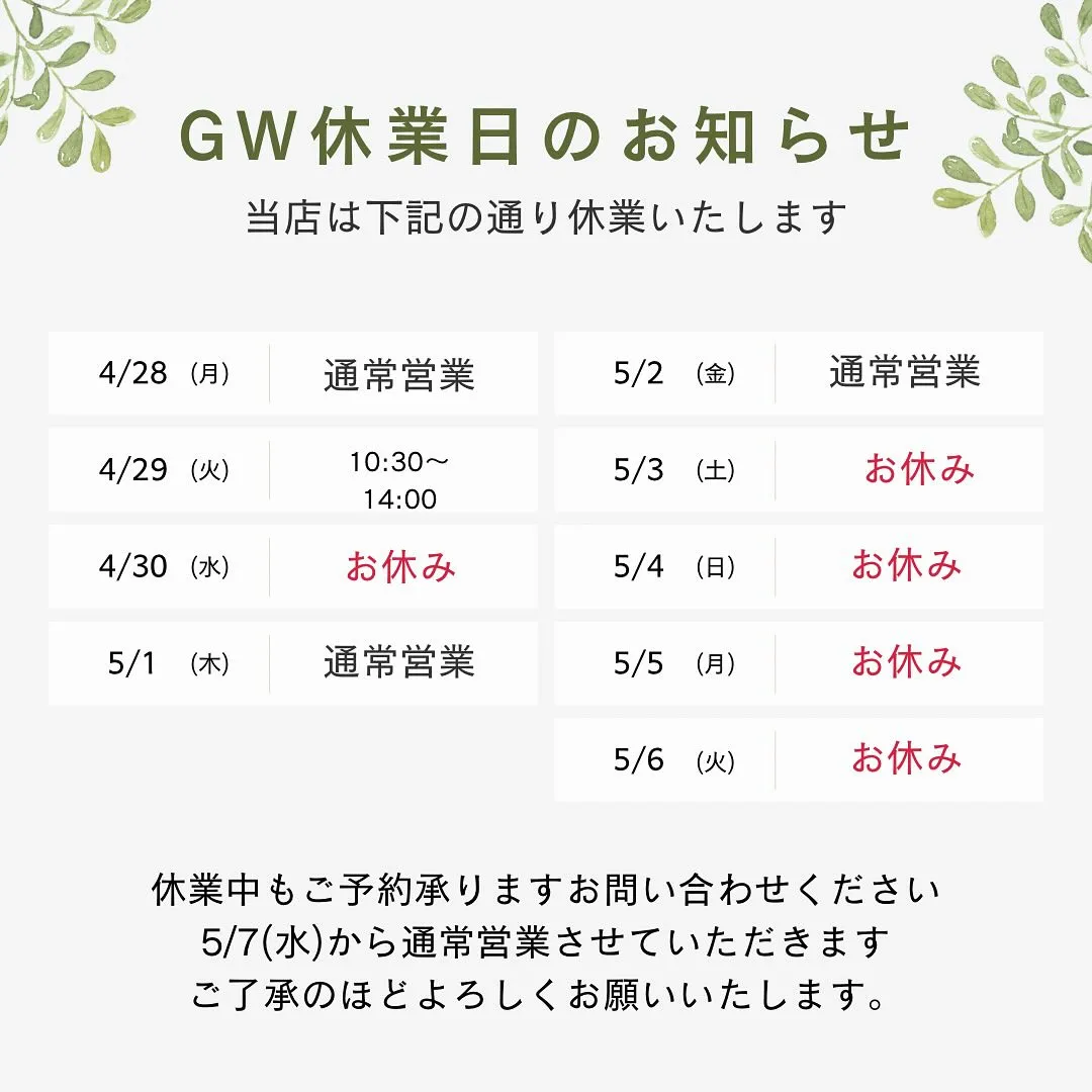 ゴールデンウィークの営業日のお知らせです