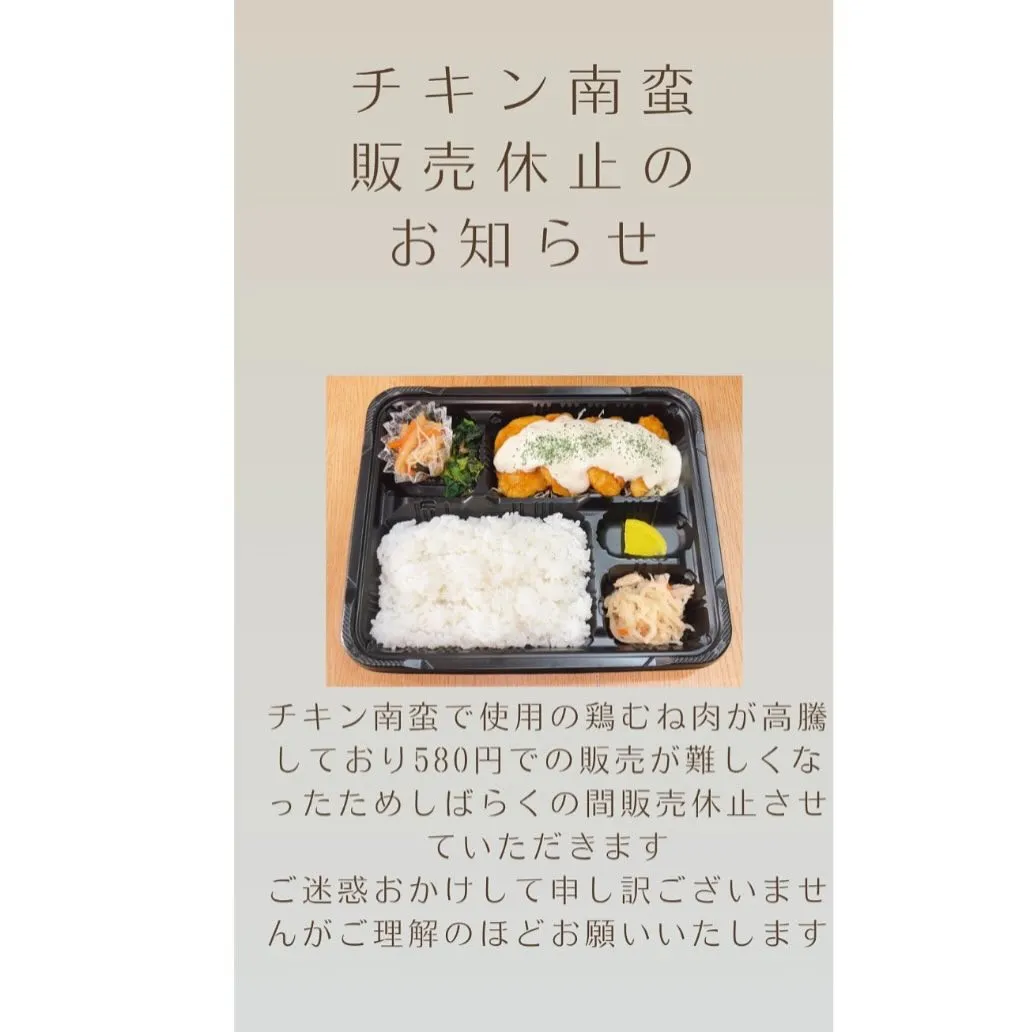 チキン南蛮弁当・チキン南蛮ですが材料の鶏むね肉が高騰しており580円での販売が難しくなったためしばらくの間チキン南蛮を休止させていただきます