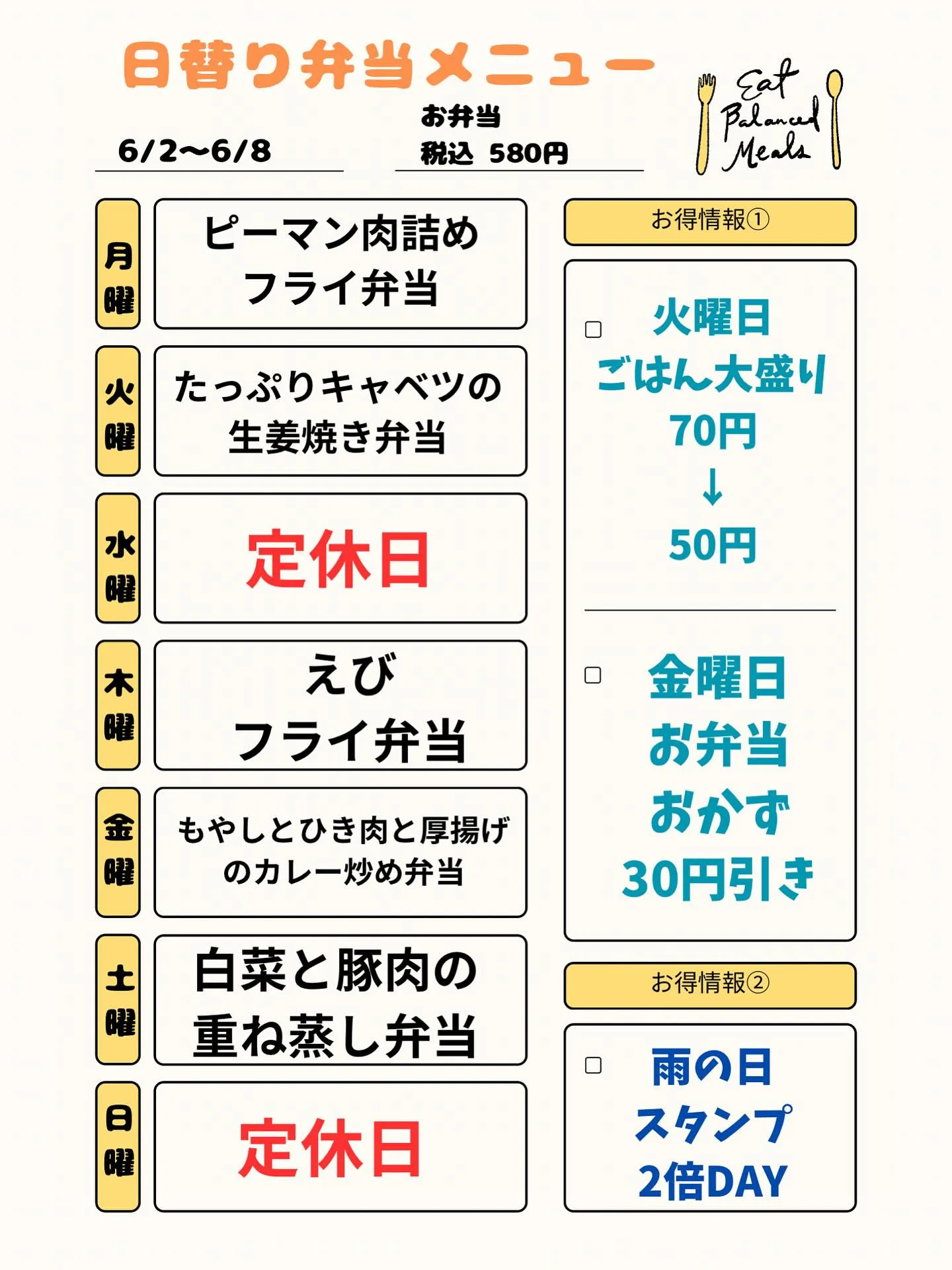 6/2〜6/8日替り弁当メニューです