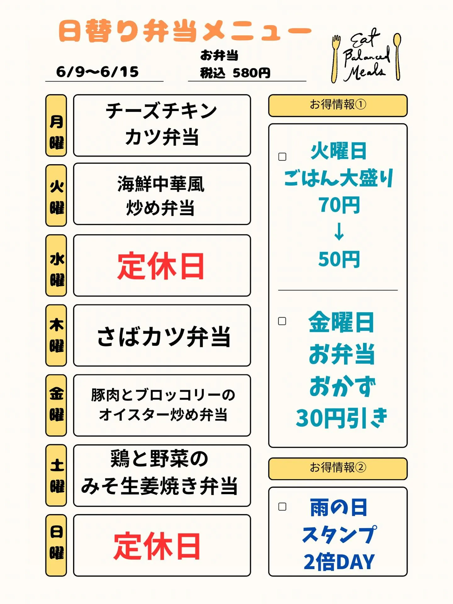 6/9〜6/15の日替り弁当メニューです