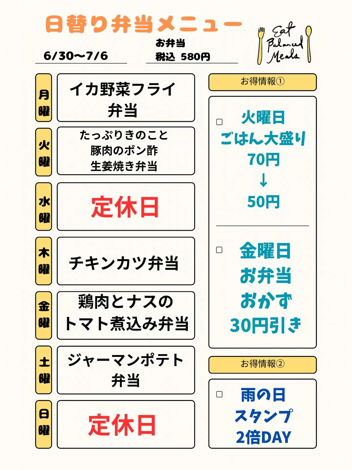 6/30〜7/6の日替り弁当メニューです