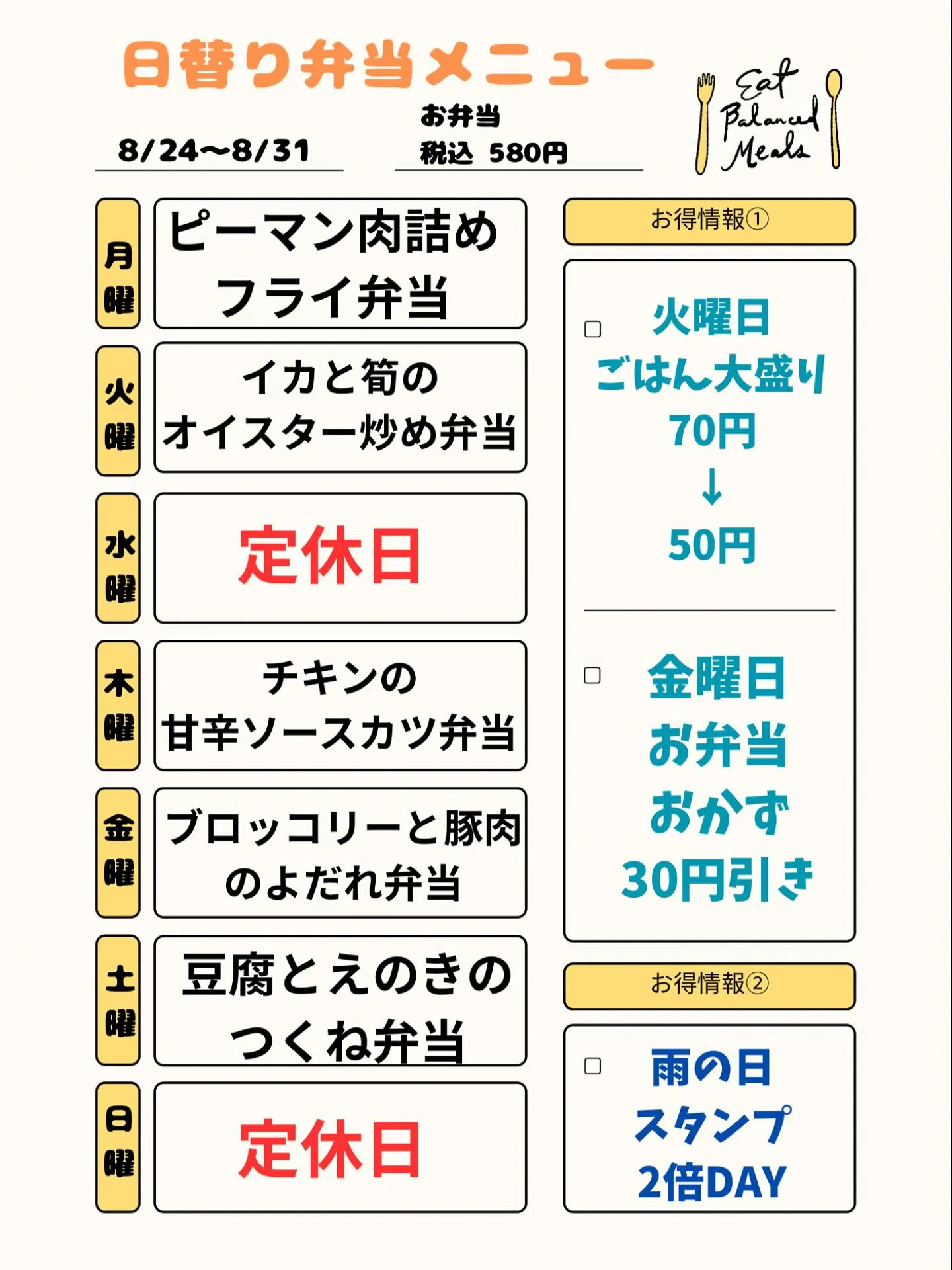 8/25〜8/31日替り弁当メニューです
