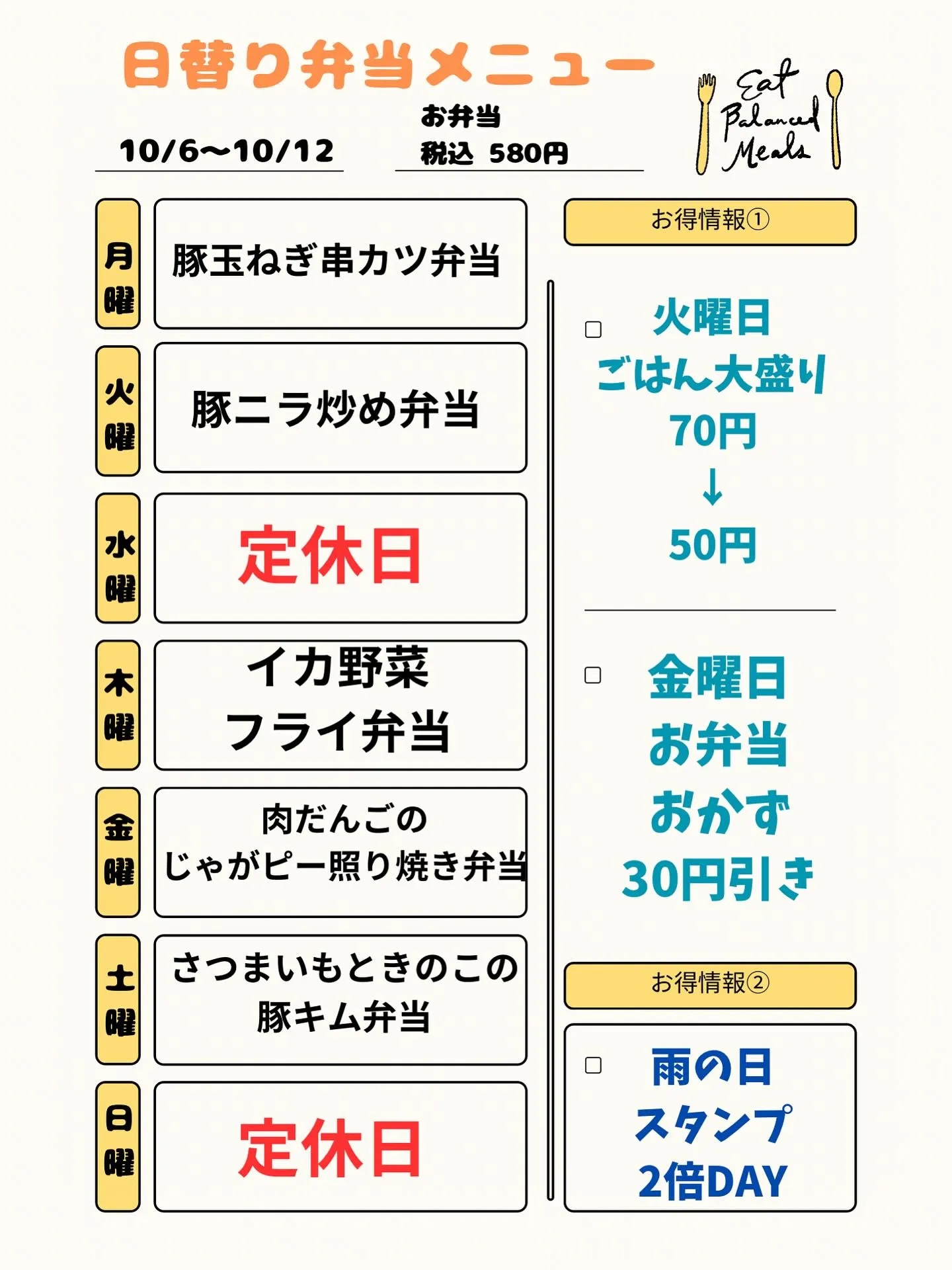 10/6〜10/12日替り弁当メニュー